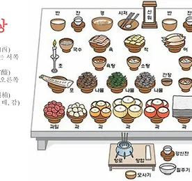 설, 추석 차례상 차리는 방법 메(백반) 탕(湯) = 육, 생선, 굴, 대합, 두부 좌반(左飯) = 미역, 콩잎, 어, 육등 숙채(熟菜) = 무나물, 콩나물, 숙주나물 침채(沈菜) = 동치미 포(脯) = 북어, 건대구, 건상어, 오징어, 육포 등 저채(菹菜) = 생김치 어물 = 생선 육물 = 간회 또는 천엽, 육회 혜 = 식혜 적(炙) = 육, 생선 등으로 만들고 5 ~7 꼬챙이를 쓴다. 병(餠) = 떡 조과 (造果) = 유과 또는 엽과 등을 쓴다. 과실 (果實) = 밤, 대추, 곶감, 배, 은행 등을 쓴다.적으면 세가지, 많아도 다섯가지 이상을 쓰지 않는다. 청장 (淸醬) = 간장을 쓴다. 작 = 초를 쓴다. ※ 제수에는 마늘과 고춧가루를 쓰지 않는다. 제수를 차려 올려 놓는 위치에도 격식이 있어요~ ..
