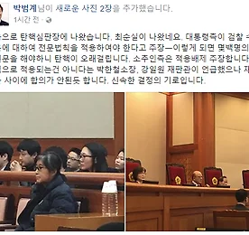 최순실 탄핵심판 5차 변론중 박근혜 대통령 탄핵심판, 5차 변론중 최순실씨가 박근혜 대통령 탄핵심판 5차 변론에 나서며 다음과 같이 주장했다. - 고영태의 증언 자체는 완전 조작 - 고영태의 진술은 신빙성이 없고, 계획적으로 모든 일을 꾸민 것 - 정유라씨 승마 지원 의혹에 대해, 너무 논리의 비약이라며 언성을 높이고 예민한 반응 - 무슨 대답을 원하는지 모르겠다. 정확하게 물어달라. - 검찰 신문을 받는 것이 아니다. 유도신문에는 대답 안하겠다. - 국회 측이 '피청구인'으로 지칭할 때마다, '피청구인이 누구냐'며 시간 끌기 # 박근혜 대통령 - 최순실, 국정농단 탄핵심판 https://goo.gl/Z8C5Xa 관련, 탄핵심판장에 참석한 박범계 의원의 페이스북 # 이하 박범계 의원 페이스북 발췌처음으로 탄핵심판장에 나왔습니다. 최.. 더보기 이전 1 ··· 1139 1140 1141 1142 1143 1144 1145 ··· 2002 다음