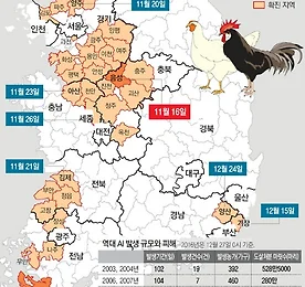 AI 조류독감 연대별 피해상화 사례 계란값이 1알에 300원을 호가하고, 생닭의 가격도 곧 오를 전망으로 보인다. 왜 이런 상황이 발생했을까? - 2003년, 2004년, 2006년, 2007년 : 800만 마리 살처분 - 2008년, 2010년, 2011년 : 1,667만마리 살처분 - 2014년, 2015년 : 1,937만마리 살처분 - 2016년 11월 진행중 : 2,730만마리 살처분 조류독감의 시기별 역대 사례를 봐도 딱 알 수 있다.자연재해급 위기대응에 대해 얼마나 무능한 정권과 그 하수인들이었는지. 항간에 그런 루머가 있다.누군가 닭을 무지 싫어해서 이런 사태가 빚어진 거라고!? # 조류독감 뉴스 및 사례 https://goo.gl/qseKJ5