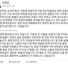 표창원 권력중독 소신발언 표창원 의원, 민주당 내부총질에 대한 사이다 발언 당내 대선주자들의 당내 분란을 야기하는 뉴스들이 끊임없이 나오고 있다.지금은 다 함께 모여 골리앗을 상대해야 할 때, 왜 같은 곳을 바라보는 사람들이 싸우는 걸까.더불어민주당 표창원 의원이 현재 야당내 분열을 조장하는 세력들에게 시원하게 풀어주셨다. 표창원 의원의 글을 읽고 짧게 요약해본 나의 생각이다. - 표창원이란 이름을 걸거나 지지하는 많은 모임과 요청, 어떤 사모임에도 관여하지 않았고 앞으로도 그럴 것이다. - 정치인의 권력추구는 당연하지만, 자신과 주변 소속 집단까지 파괴하며 권력추구를 하는 것은 권력중독이다. - 공정성과 합리성 넘어서는 안될 금도를 지킵시다. 이기지 못할 것 같으면 물러서거나 끝까지 도전하되 결과를 받아 들이자. 이하, 표창원.. 더보기 이전 1 ··· 1178 1179 1180 1181 1182 1183 1184 ··· 2002 다음
