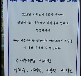 성남시 야외스케이트장 폐쇄 성남시 야외 스케이트장 폐쇄 인터넷 커뮤니티에 야외 스케이트장 예산 삭감에 따른 안내문에 화제가 되고 있다. 내용은, 2017년 야외스케이트장 예산이 성남시의회 새누리당 의원들의 반대로 삭감되어서 다음 겨울부터는 성남시청 야외스케이트장을 더 이상 이용 할 수 없습니다.'라는 내용으로 게재되었고 이를 네티즌이 찍어 올리면서 퍼지고 있다. 문제가 되는 부분은, 야외스케이트장 예산 삭감에 따른 안내문 밑에 새누리당 시의회 의원 이름이 적혀있는데, 누가 적었는지 밝혀지지 않았고, 이 또한 사실인지 아닌지 확인된 바가 없는 상태이다. 다만, 실제 예산이 삭감된 것은 맞고 야외스케이트장이 성남시청이이 아닌 다른 곳으로 이전될 수도 있다는 뉴스가 보도되고 있다. 성남시청 야외스케이트장 폐쇄, 새누리당 시의원 예산삭감.. 더보기 이전 1 ··· 1228 1229 1230 1231 1232 1233 1234 ··· 2002 다음