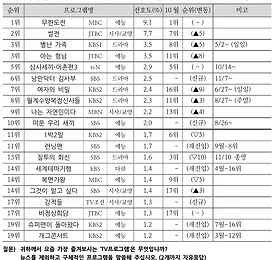 TV 프로그램 선호도 조사 무한도전 1위, 썰전 2위, 아는형님 3위 인기 프로그램 1위 한국갤럽에서, 즐겨보는 프로그램 1위로 무한도전이 선정되었다.선호도는 시청률 순위와는 틀리다. ㅇ 조시가간 2016년 11월 15일 ~ 11월 17일까지 3일간 ㅇ 대상 : 전국 만 19세 이상 남녀, 1007명ㅇ 질문 : 요즘 가장 즐겨보는 TV프로그램은?(뉴스제외), 2개까지 자유응답 무한도전은 선호도 9.1%로 26개월 연속 1위를 지켰다.하지만 선호도 수치는 지난 달 10%보다 밑돌고 있어 평소보다 낮은 편에 속한다. JTBC는 썰전, 아는형님을 5위권안에 올리며 상승세를 이어가고 있다. 선호도 2위 프로그램 2위는 예상외로 썰전이 차지했다.아무래도 10월 최순실 국정농단 건이 보도되며, 정치에 관심없던 일반까지 내려온 이유같다. 자료 출처 : http://www.gallup... 더보기 이전 1 ··· 1284 1285 1286 1287 1288 1289 1290 ··· 2002 다음