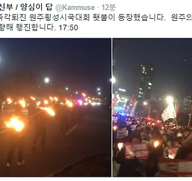 촛불집회 8차 8차 촛불집회 8차 촛불집회이자, 대통령 탄핵 이후 2번째 집회가 진행중이다. 참석자는 77만 정도 8차 촛불집회 뉴스 https://goo.gl/J6o3mW 탄핵이 될 때까지 촛불이 사그러 들지 않기를 바란다. 트위터에서는 촛불이 횃불이 된 사진도 등장하고 있다. 한편 박사모 및 탄핵반대 맞불집회가 진행중이기도 하다. 박사모 측에서는 100만이라는데 1만도 되어보이질 않는다. 경찰은 집회 인원으로 3만을 추산했다. 경찰측 추산이면?? 어르신들 힘드실텐데, 감기드실라 어서 집에 들어가서 쉬시기를. 맞불집회, 박사모 보수진영 집회 뉴스 https://goo.gl/GME4Nl 이하, 트위터 촛불집회 8차 사진들 더보기 이전 1 ··· 1376 1377 1378 1379 1380 1381 1382 ··· 2002 다음