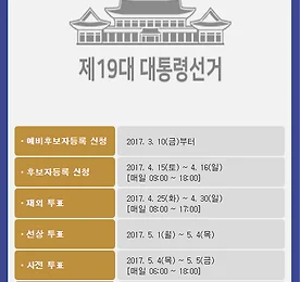 19대 대통령선거 5월 9일 임시공휴일 확정 중앙선거관리위원회의 홈페이지에 보면 19대 대통령선거 일자가 공지되어 있다.또한 대통령 선거가 치뤄지는 5월9일은 임시공휴일로 지정된다. - 선거 예비 후보자 등록 신청 : 2017.01.10(금)부터 - 후보자등록 신청 : 2017. 04. 15(토) ~ 04. 16(일) - 재외 투표 : 04.25(화) ~ 04.30(일), 매일 08:00 ~ 17:00 - 선상 투표 : 05.01(월) ~ 05.04(목) - 사전 투표 : 05.04(목) ~ 05.05(금), 매일 06:00 ~ 18:00 - 투표일 : 05.09(화), 06:00 ~ 20:00 # 선관위 홈페이지 http://info.nec.go.kr/ 더보기 이전 1 ··· 463 464 465 466 467 468 469 ··· 2002 다음
