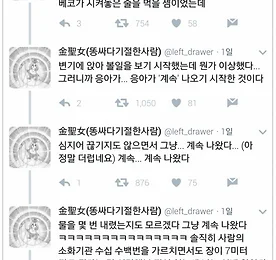 똥 싸다가 기절한 사람, 차전자피와 화이버슬림 먹고 똥이 안 끊겨... 트위터에서 아이디조차 똥 싸다가 기절한 사람 이야기다. 차전자피와 화이버슬림을 먹고 똥을 길게 싸다가 힘이 풀려 기절했다고 하는 트위터 작성자. 물을 몇 번을 내릴 정도로 계속 나왔다고 한다. 차전자피야 변비 있는 사람한테 유명했는데 화이버슬림은 또 무엇인가. 이 사람이 네이티브 광고 집행자라면 대단하다. 필력이 아주 좋다. 술술 익힌다. 더보기 이전 1 ··· 49 50 51 52 53 54 55 ··· 2002 다음
