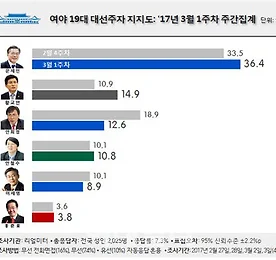 민주당 토론회 2차 민주당(더불어민주당) 토론회, 대선후보 토론회 2차가 진행준비중이다.지난 주 민주당 토론회 1차 이후 리얼미터 여론조사를 보면 - 문재인 33.5% > 36.4% - 황교안 10.9% > 14.9% - 안희정 18.9% > 12.6% - 이재명10.1% > 8.9% 선의와 적폐청산, 대연정에 대한 안희정 지사의 이탈이 심하게 나타나고 있다.초반 이재명 시장의 상승에서 하락세로 돌아서는 정도로 빠르게 이탈이 나타나고 있다.금요일에 나오는 한국갤럽 여론조사를 보면 조금 더 확실히 나올 듯. 보수계열은 황교안 권한대행으로 추가 기울어가는 모양새다.출마할지는 모르겠지만... 최성 고양시장도 기대된다.어떤 시원한 발언을 가질지. 3월 6일 생방송 진행중에만 시청 가능하다. 리얼미터 3월 1주차 대통령 후보 여론조사 더보기 이전 1 ··· 604 605 606 607 608 609 610 ··· 2002 다음