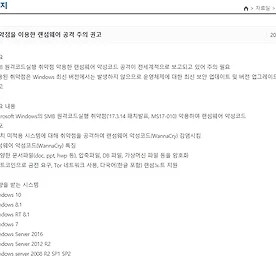 랜섬웨어 예방, 윈도우 최신버전 업데이트. SMB 취약점 업데이트 5월15일자 랜섬웨어 예방 주의보가 떴다. 이는 윈도우를 최신 버전으로 유지하면 되는데 일부 사용자들이 윈도우 업데이트를 끄고 사용하면서 크게 번지기도 했다. 이전의 XP SMB 랜섬웨어 사건이 그런 경우인데, 오래된 OS이기도 하고, 업데이트를 받지 않아서 많이 공격받았다고 한다. 또한 윈도우7조차 랜섬웨어에 많이 노출되어 있다. 윈도우 XP, 윈도우7, 윈도우8 사용자들은 아래 마이크르소프트 사이트에서 필수로 업데이트 받을 것을 권고한다.(KISA 발표) # https://technet.microsoft.com/en-us/library/security/ms17-010.aspx - MS공식 사이트, 자신의 윈도우 버전에 맞는 업데이트를 사용한다. # 윈도우 자동 업데이트 사용하기(윈도우 10기준) - .. 더보기 이전 1 ··· 65 66 67 68 69 70 71 ··· 2002 다음